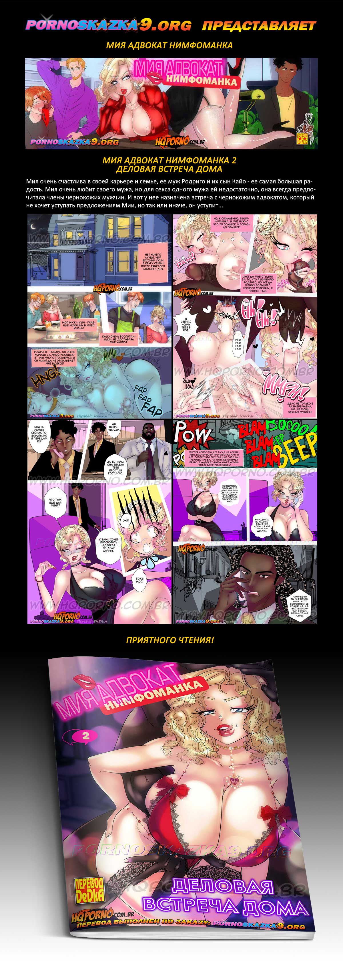 Порно комикс «Мия адвокат нимфоманка. Часть 2. Деловая встреча дома.» Мия очень счастлива в своей карьере и семье, ее муж Родриго и их сын Кайо — ее самая большая радость. Мия очень любит своего мужа, но для секса одного мужа ей недостаточно, она всегда предпочитала члены чернокожих мужчин. И вот у нее назначена встреча с чернокожим адвокатом, который не хочет уступать предложениям Мии, но так или иначе, он уступит…